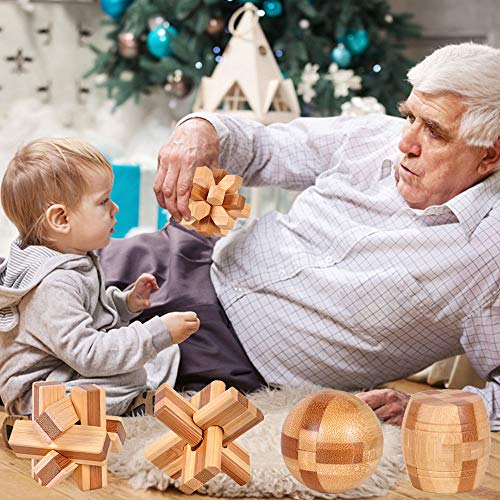 Dimensione - puzzle rompicapo di 9 pezzi sono fatti di bambù con finitura liscia. Mini Dimensioni: Circa 4,5 x 4,5 x 4,5 cm per puzzle, Peso: 350 g in tutto. Facile da trasportare.