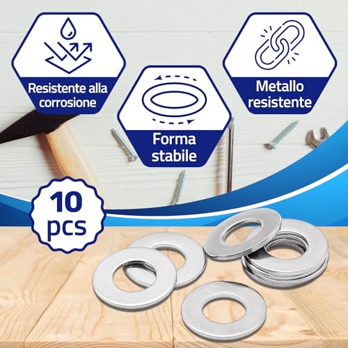 Le rondelle acciaio inox sono ampiamente utilizzate in varie applicazioni per distribuire i carichi, ridurre l'attrito e fornire una superficie di appoggio liscia tra due parti da unire. Il set comprende 10 pezzi.