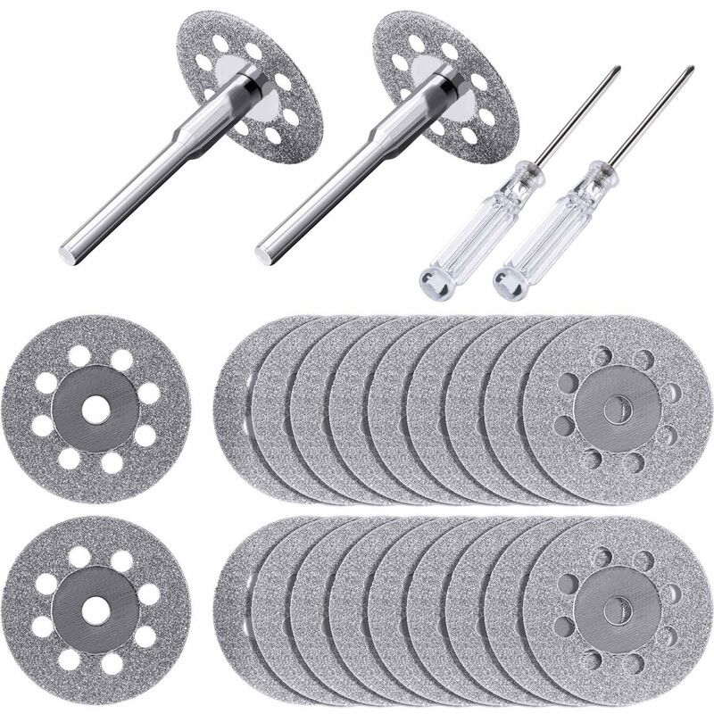 Confezione da 20 dischi diamantati da 22 mm con 4 mandrini da 3 mm e 2 driver di cristallo per utensili rotanti Dremel Caratteristiche: I dischi da taglio sono robusti e durevoli, sono rivestiti con fini particelle di diamante e progettato con fori per l'aria per ridurre il calore e rimuovere i detriti, adatto per realizzare fessure e fessure. Usi multipli: Questo kit di dischi da taglio è adatto per il fai da te, tagliare, segare, intagliare, affilare e limare materiali duri tra cui la maggior parte dei tipi di pietre preziose, giada, marmo, cemento, mattoni, porcellana, ceramica, resina epossidica e altri legni duri, ma non consigliato per metallo. Specifiche: Materiale del disco da taglio: acciaio al carbonio. Rivestimento: bilaterale e bordo Compatibilità: compatibile con utensili rotanti Dremel Dimensioni del prodotto: Diametro disco: 22 mm Spessore disco: 0, 6 mm Lunghezza mandrino: 35 mm Diametro mandrino: 3 mm Lunghezza cacciavite: 98 mm Contenuto: 20 mole diamantate. 4