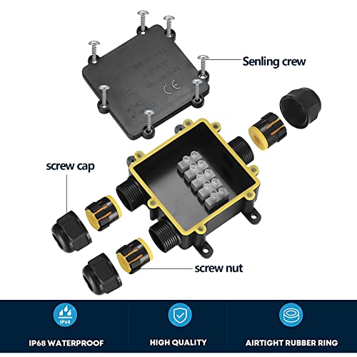 【Materiale Premium】 La scatola di giunzione IP68 impermeabile è realizzata con l'eccellente guscio in plastica e materiale dell'anello in silicone con prestazioni resistenti al calore, che garantisce la massima resistenza e prolunga la durata, non si spezzerà o sbiadirà, durevole per molti anni.