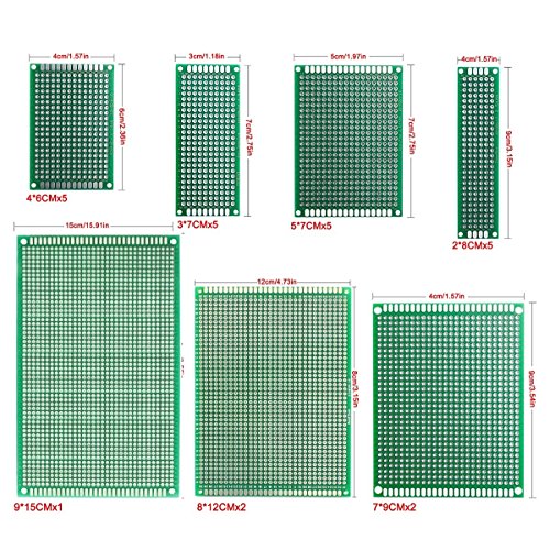 Scheda PCB: ci sono 25 schede in 7 diverse dimensioni, 5pcs 2x8cm, 5pcs 3x7cm, 5pcs 4x6cm, 5pcs 5x7cm, 2pcs 7x9cm, 2pcs 8x12cm, 1pc 9x15cm, che permettono di adattarsi ai tuoi componenti, senza bisogno di tagliare una grande piastra perforata, e puoi anche forare i lati per l'integrazione delle piastre.