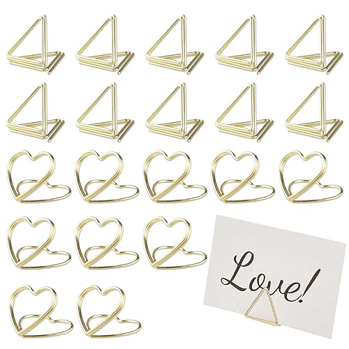 XPEX 20 Pezzi Mini Segnaposto Porta Carte da Tavolo,Supporti per Carte da Tavolo Triangolo E A Forma di Cuore, Segnaposto per Matrimoni, Numeri da Tavolo, Foto, Clip per Feste di Compleanno (Oro)