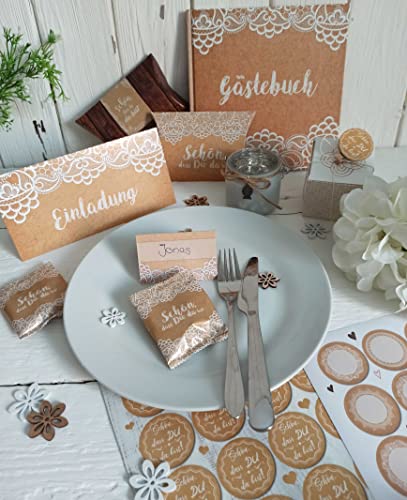 Oltre a questi espositori da tavolo abbiamo ancora su misura e disponibili separatamente nel nostro negozio Amazon: Segnaposto, targhette per il nome, libro degli ospiti, biglietti di invito, piccole scatole regalo come confezione per regali per i vostri ospiti e un ricettario dove potete aggiungere le vostre ricette.