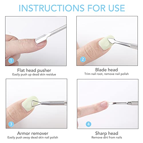 ★Spingi cuticole: lo spingi cuticole ha una punta a forma di cucchiaio che rimuove la cuticola in più sull'unghia. L'altra estremità è costituita da una piccola punta che viene utilizzata per rimuovere lo sporco in eccesso sotto la punta dell'unghia. Fai attenzione quando usi oggetti duri.