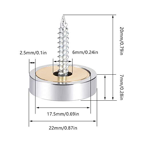 Dimensioni: ogni piastra di copertura ha un diametro di 22 mm. La confezione include: 4 chiodi a specchio, 4 viti e 4 rondelle.