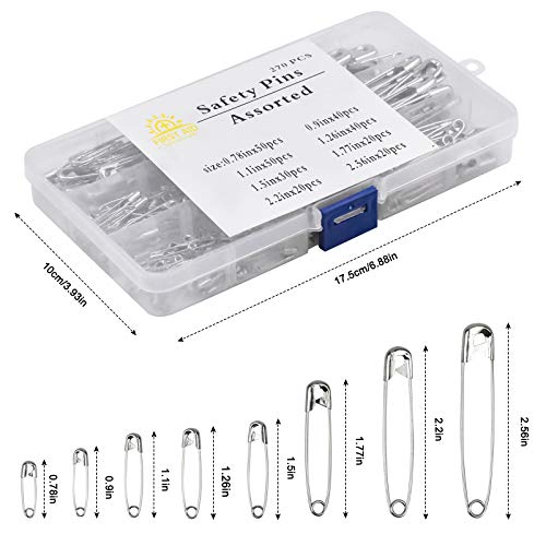 [8 dimensioni per le tue esigenze]: 270 pezzi di spille da balia include 8 taglie: 0,78 pollici, 0,9 pollici, 1,1 pollici, 1,26 pollici, 1,5 pollici, 1,77 pollici, 2,2 pollici e 2,56 pollici, varie dimensioni per la tua opzione da applicare a diverse occasioni .