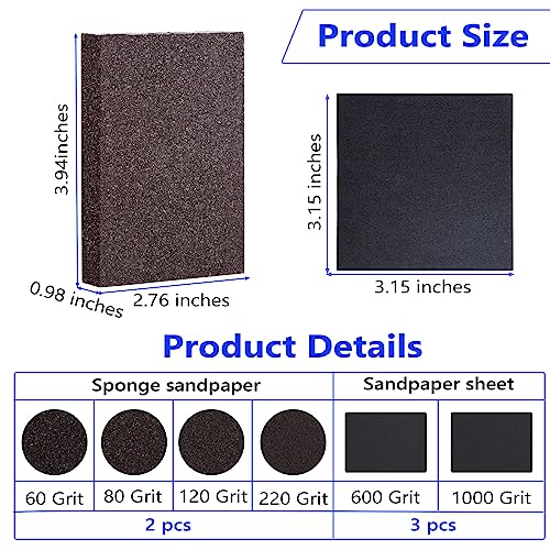 Il pacchetto include: Otterrete un totale di 14 pezzi di kit di levigatura, includono 8 pz di 4 gradi spugne di levigatura dall'assortimento di specifiche grossolane a superfine in grana 60/80/120/180/220, ogni grana ha 2 pz, e 6 pz di 2 gradi foglio di carta vetrata in grana 600/1000, ogni grana ha 3 pz, Nota: Il numero più piccolo significa la grana più grossa e la maggiore efficienza della lucidatura, ma più ruvida è l'effetto di levigatura.