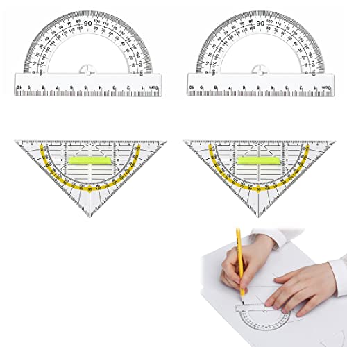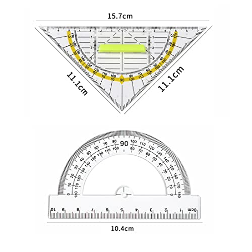 2 Pezzi Squadra Geometrica in Plastica, Squadra Geometrica per Scuola e Ufficio + 2 Pezzi 2 in 1 Goniometro a 180° e righello da 10 cm