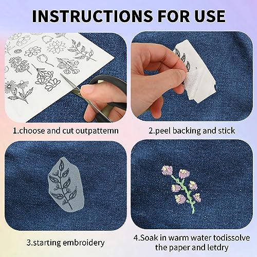 【Facile da usare】: devi solo tagliare il motivo preferito con le forbici, incollare gli adesivi da cucire in qualsiasi tessuto che devi decorare, utilizzare diversi colori di linee per ricamare in base al motivo fornito sullo stabilizzatore ricamato. Dopo il completamento, immergi il tessuto in acqua per lavare l'adesivo.