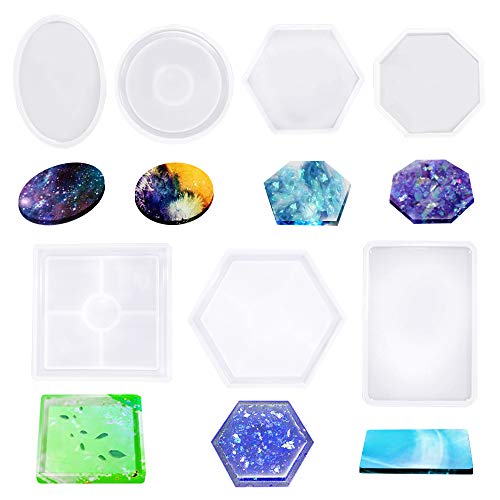 Set di sottobicchieri di valore: 7 stampi in silicone per sottobicchieri, tra cui 1 stampo rettangolare, 1 stampo quadrato, 1 stampo esagonale grande, 1 stampo esagonale piccolo, 1 stampo esagonale, 1 stampo rotondo, 1 stampo ovale e 1 stampo ottagonale.