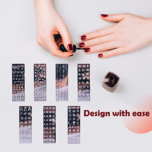 ⚜️【Modelli multipli】: un set di sette piastre in acciaio con motivi non ripetitivi, tra cui piante, fiori, fiocchi di neve, alci, forme geometriche, ecc., Una varietà di motivi ti offre una varietà di opzioni per soddisfare la tua festa quotidiana o festa esigenze di nail art.
