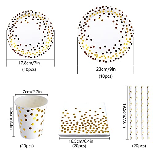 FANCY ELEGANT DESIGN - Questo pacchetto di accessori per feste è progettato su uno sfondo bianco e un motivo a pois dorati. I piatti e le tazze di carta bianca hanno tutti un'attraente punta di lamina dorata. Scelta perfetta per una festa a tema bianco e oro.