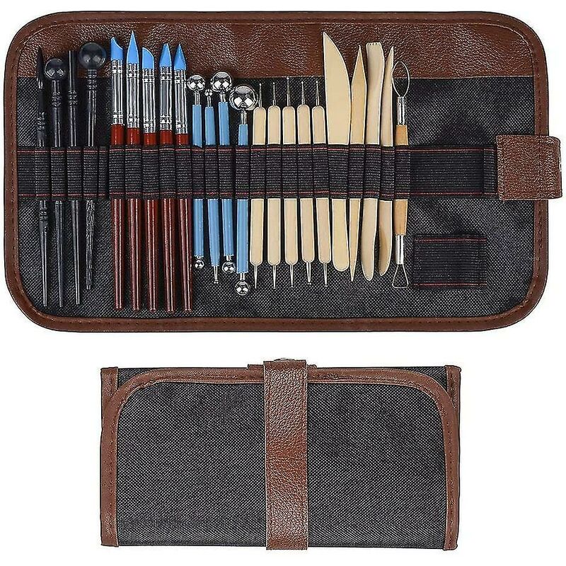 Il pacchetto include: 5 strumenti per punteggiare, 5 strumenti in ceramica, 5 penne in gomma, 4 penne a sfera in acciaio inossidabile, 4 kit di plastica, 1 spugna di ceramica, anche con una custodia in tela, mantieni questi strumenti di scultura ben organizzati e facili da trasportare. . Materiale premium: acciaio inossidabile, gomma, plastica, legno. La penna a sfera in acciaio inossidabile è robusta e resistente, il manico in legno è molto liscio e confortevole, facile da impugnare. La spugna di ceramica è perfetta per pulire, levigare, aggiungere o assorbire acqua. Design a doppia estremità: lo strumento per ceramica di argilla a doppia estremità offre maggiore flessibilità e praticità per il tuo design. Varietàu0026 Versatilità: strumenti a dondolo di diverse dimensioni e forme consentono di scolpire diversi dettagli, perfetti per scolpire, sfumare, disegnare, tagliare, raschiare, pulire, modellare, dipingere. Ampia applicazione: ottimo per polimeri, plastica modellabile