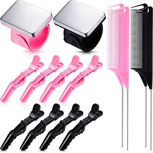 14 Pezzi Strumenti per Intrecciare Capelli 2 Pezzi Polsino con Spilla Magnetica 4 Pettini per Separare con 8 Pezzi Clip per Capelli Sezionatrice a Coccodrillo a Denti Larghi (Nero, Rosa)