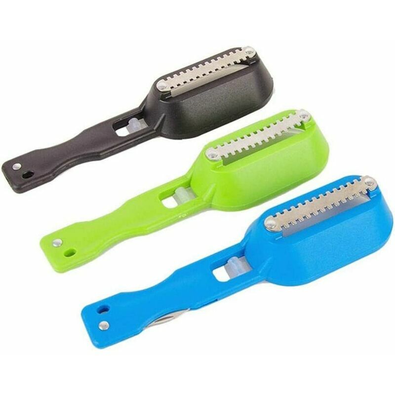 ASSEMBLAGGIO FACILE PULIZIA FACILE. Design di assemblaggio semplice. Facile da pulire, basta sciacquare il corpo con acqua Decalcificazione rapida e sicura: il design della lama seghettata in acciaio inossidabile rimuove le squame molto rapidamente e ti evita di tagliarti la mano durante l'utilizzo grazie al suo design non affilato. Realizzato in ABS e acciaio inossidabile, sicuro e durevole. La lama è ideale per raschiare le squame di pesce più velocemente e più facilmente. Design ergonomico: comodo da impugnare e utilizzare, presa senza sforzo, nessuno slittamento Dimensioni: 19 cm