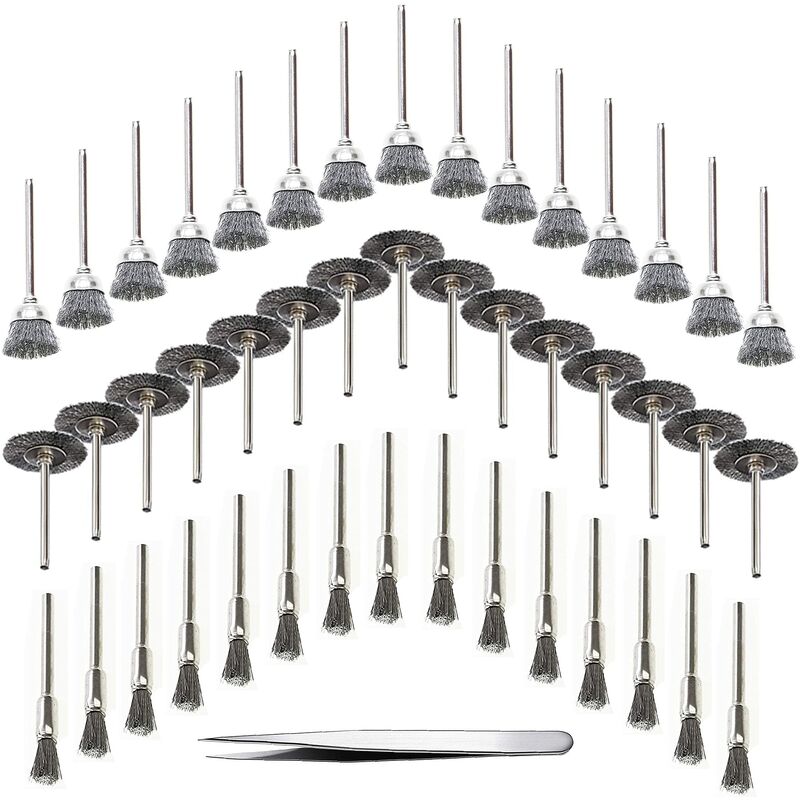 Set di spazzole metalliche - - 45 pezzi di diverse spazzole metalliche, per un totale di 3 design, tra cui 15 spazzole a ruota, 15 spazzole a tazza e 15 spazzole. [Varie dimensioni] -Diametro del manico: 3 mm (1/8 di pollice), spazzola per ruote: 23 mm / 0,9 pollici, spazzola a tazza: 15 mm / 0,6 pollici, spazzola: 5 mm / 0,2 pollici. [Materiale di alta qualità] - Il filo il set di spazzole è realizzato in acciaio inossidabile, che è resistente e ha una lunga durata nei lavori di pulizia più difficili. [Eliminazione della ruggine e lucidatura] - La spazzola metallica è molto adatta per la rimozione della ruggine, la rimozione della ruggine, rimozione di sbavature, rimozione di schiuma, rimozione di vecchie vernici, pulizia meccanica e lucidatura di scanalature o bordi su superfici metalliche. [Ambito di applicazione] -Set di spazzole metalliche, adatto per la rimozione della ruggine e la pulizia fine dei metalli s, legno, pietra, materiali metallici e altri piccoli metalli. Adatto per