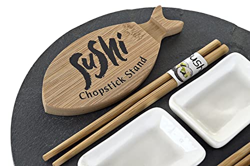 MGE - 7 Pezzi Set di Sushi - Kit Sushi - 2 Ciotoline per Salse + 2 Bastoncini + 1 Lastra in Ardesia + 2 Poggiabacchette - Set Sushi per 2 Persone (Design 1)