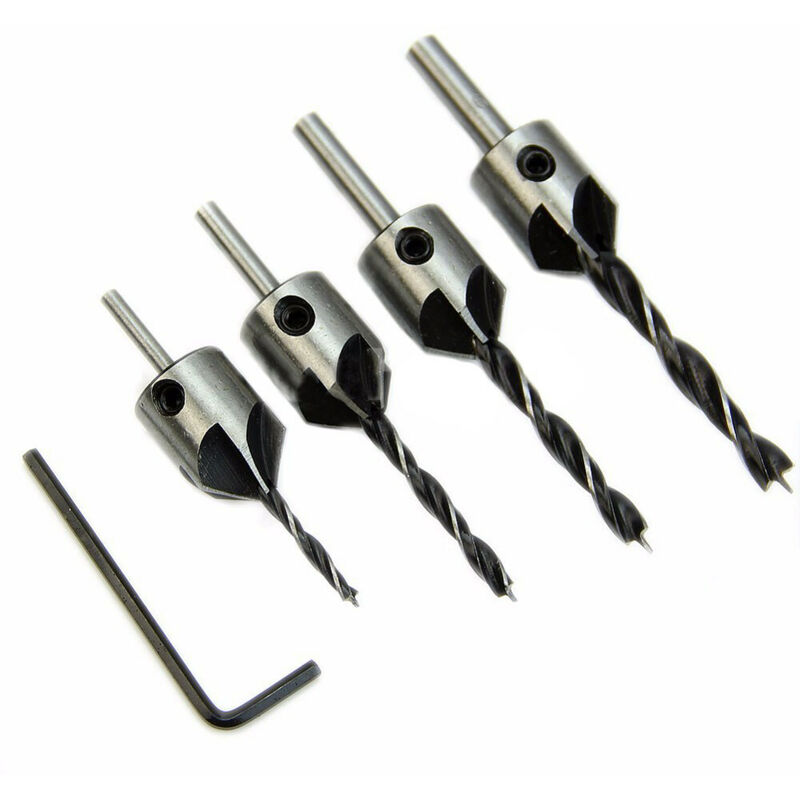 altri metalli, plastica o legno. Allargare o svasare i fori, sbavare i bordi. Ottimo accessorio per trapano per qualsiasi officina supportato dalla garanzia a vita del produttore. Specifiche: Materiale: Punta HSS 4241 Materiale corpo punta smusso nero: acciaio #45 Diametro smusso: 15,8 mm Dimensioni: 3 mm x 60 mm( L)/ 4 mm x 75 mm (L)/ 5 mm x 85 mm (L)/ 6 mm x 93 mm (L) *10*2 cm/5,51*3,93*0,78 pollici Peso della confezione: 115 g Nota: Il colore dell'articolo può mostrare un'aberrazione visiva a causa della diversa luce di ripresa e del display del monitor. Il pacchetto include: 4 pz* Smusso per la lavorazione del legno 1 pz* Gambo esagonale