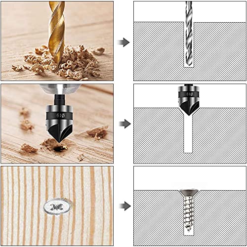 【Ampiamente Usato】 Il set di punte per trapano svasatore viene utilizzato principalmente per aperture in legno, alesatura, smussatura, adatto per legno, metallo morbido, gomma, plastica e altri materiali a bassa durezza.