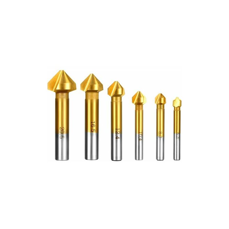 Ideale per realizzare fori svasati per teste di viti svasate, nonché fori svasati per tasselli Gli svasatori sono realizzati di acciaio al carbonio, la superficie è rivestita in titanio, robusto e durevole, non facile da arrugginire, lunga durata. Questo kit è adatto per il fai da te domestico e per l'uso quotidiano, consente di forare in modo facile ed efficiente, senza bave. Dimensione universale compatibile con tutti i tipi di punte da trapano, trapani, compresi trapani verticali e altri comuni svasatori. Questo set di 6 frese da trapano a 3 taglienti a 90 gradi è adatto per lavorare su metallo e alcuni materiali non metallici, come acciaio al carbonio, ferro leggero, pannelli isolanti, pannelli in PVC, alluminio, legno duro e tenero, ecc.、 Caratteristiche: Impugnatura: impugnatura rotonda Utilizzata con durezza 25 sotto il pezzo, come acciaio al carbonio, lamiera, pannelli isolanti, pannelli in PVC, legno Per il foro del pezzo di 90 ° smusso o foro conico, la superficie degli