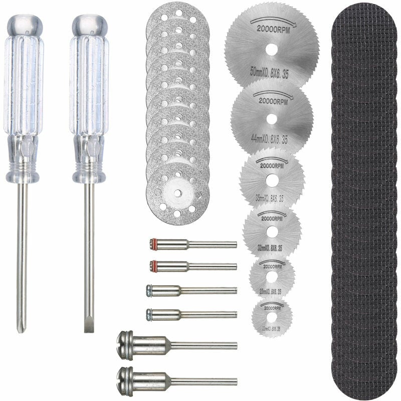 acciaio, ecc 10 dischi da taglio: per taglio di giada, vetro, mattoni, ecc X6 HSS 6 lama per sega circolare con 6: diversi diametri esterni, utilizzata per il taglio del legno, plastica, tubi in PVC, ecc. Alberi di pergolato X6: con diametro dell'asta di 3mm, utilizzati per tenere la ruota di taglio e il disco di taglio. Custodia di stoccaggio: una custodia trasparente per la conservazione di tutti gli accessori da taglio. Applicazioni diffuse: con alta efficienza lavorativa, durevole e pratico per produrre un