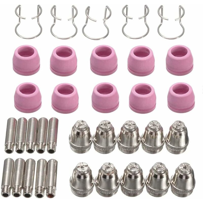 35 pezzi - Questo materiale di consumo per la taglierina al plasma contiene 10 gusci protettivi in ceramica, 10 elettrodi, 10 ugelli e 5 anelli guida 【Compatibile】 Questi materiali di consumo sono adatti per bruciatori SG55, AG60 che funzionano con CUT60, LGK60, P60. 【Alta qualità】 Gli ugelli e gli elettrodi sono realizzati in rame di alta qualità e sono elettroplaccati. 【Facile da sostituire】 Molti ugelli ed elettrodi non hanno parti di ricambio. Puoi sostituire quello danneggiato durante il processo di taglio.