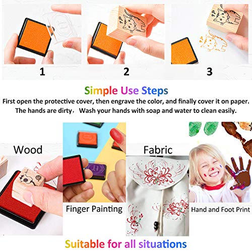 Uso del tampone d'inchiostro: il nostro tampone di inchiostro a 20 colori può essere raffigurato liberamente su carta, legno, tessuto, ecc. Può essere utilizzato per artigianato, progetti di pittura, album fotografici fai da te, diari, biglietti di auguri, scrapbooking, buste, biglietti di Pasqua, etichette regalo. Può essere trasformato in un bellissimo regalo di vacanza, souvenir attraverso la tua creazione.