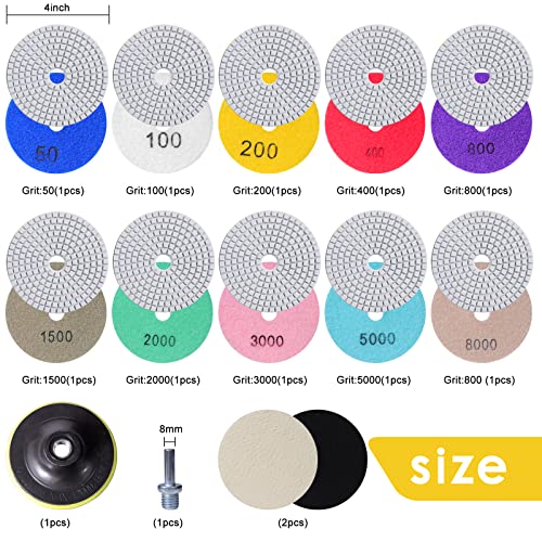 【Set di grande valore】 I tamponi di lucidatura diamantati da 4 pollici con 12 grane diverse soddisfano le vostre esigenze. 50#, 100#, 200#, 400#, 800#, 1500#, 2000#, 3000#, 5000#, 8000#), 2PCS tamponi di lucidatura in feltro di lana fine, 1PC tampone di supporto in gomma resistente (filettatura M14) e 1PC punta di trapano (8mm).