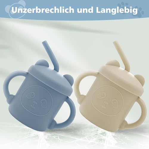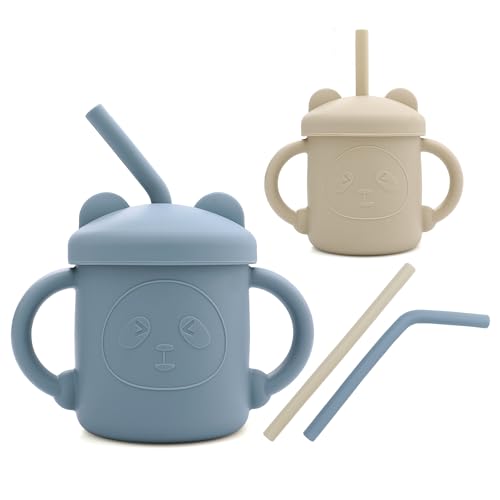 2 Pezzi Tazze con Cannuccia per Bambini Silicone Bicchiere con Manici Tazza di Allenamento 200 ml Baby Training Cup, 7+ Mesi, Senza BPA, per Microonde e Lavastoviglie (Blu + Bianco Mandorla)