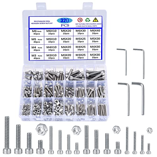 320 Pezzi Viti a Testa Esagonale in Acciaio Inossidabile, M3/M4/M5/M6 Kit Assortimento Viti Dadi e Rondelle, Viti a Brugola, Viti a Macchina, Tappo Esagonale a Bussola Viti Bulloni