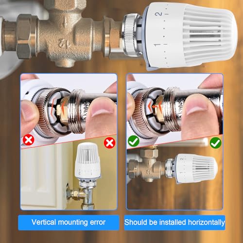 Nessun intervallo di regolazione della temperatura fisso: questa valvola termostatica per radiatore non ha un intervallo di regolazione della temperatura fisso, che viene influenzato dalla temperatura di riscaldamento e dalla temperatura ambiente e può rilevare variazioni della temperatura esterna. La sostituzione di un vecchio termostato facile da montare e non c'è pericolo di perdite d'acqua. Basta rimuovere il vecchio sensore e sostituirlo con uno nuovo, regolare il termostato direttamente sulla valvola, senza utilizzare adattatore.