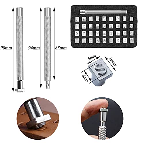 【Set di punzoni per timbri con numeri e lettere】 Il set di timbri in metallo contiene 26 timbri dalla A alla Z maiuscola, 10 numeri da 0 a 9 timbri e 1 maniglia di spinta, lo strumento per punzonatura è comodo da impugnare, puoi facilmente incidere numeri e lettere su pelle come necessario, contribuendo a rendere i tuoi prodotti in pelle più belli e personalizzati.