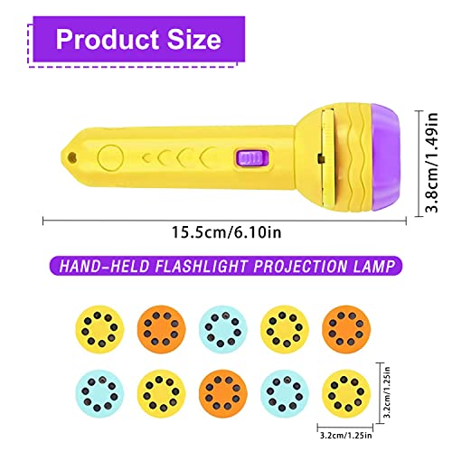 【Set di giocattoli dinosauri】: le torce per proiettore per bambini in scatole a colori (una in verde/una in giallo), dieci diapositive (tra cui dinosauri, numeri, frutta, insetti, veicoli, animali, lettere, oceani, ecc.) e 80 diversi modelli. Sono molto popolari tra i bambini. come le immagini proiettate sembrano diverse da diverse distanze. Allo stesso tempo, i bambini comprendono la conoscenza generale dell'ottica.