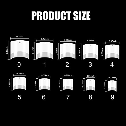 Contenuto della confezione: riceverai 500 pezzi unghie finte corte, di cui 10 diverse misure con 50 pezzi punte delle unghie di ogni misura numerate rispettivamente da 0 a 9. È conveniente trovare una misura adatta alle tue unghie.