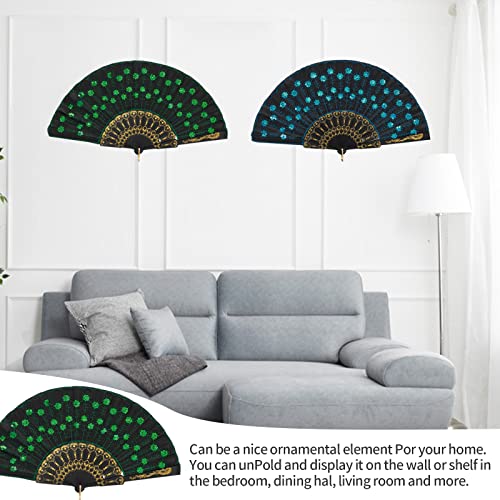 2 Pezzi Ventilatore Portatile Pieghevole,Ventaglio Rave,Ventaglio in Stile Cinese Ricamato Blu e Verde,Fan di Lustrini Coda di Pavone per Compleanno Festa di Nozze Decorazione