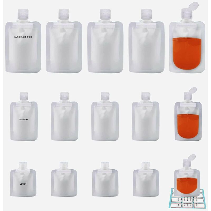 Squeeze Pouch - Borse da viaggio portatili da 15 pezzi: 30 ml Dimensioni x 5, 50 ml Dimensioni x 5, 100 ml Dimensioni x 5. Perfetto per l'aeroporto. Tre diverse dimensioni e quantità sufficienti soddisferanno tutte le tue esigenze e quelle della tua famiglia. Materiale affidabile: realizzato in materiale plastico PET di alta qualità, ottima tenuta, ricaricabile, durevole, riutilizzabile, leggero e delicato sulla pelle. Corpo trasparente e prestampato & le etichette vuote consentono di distinguere facilmente il contenuto di ciascun contenitore. Bottiglie da viaggio a prova di perdite: le buste da viaggio vuote con tappo a vite e tappo a scatto adottano un design a prova di perdite e possono essere pieghevoli. Qualsiasi liquido starà bene all'interno. Non c'è bisogno di preoccuparsi di perdite. Una meravigliosa necessità quotidiana di viaggio per te. Salvaspazio: il volume della borsa è sottile come un foglio di carta e non occupa spazio. Fondo verticale per una facile conservazione.