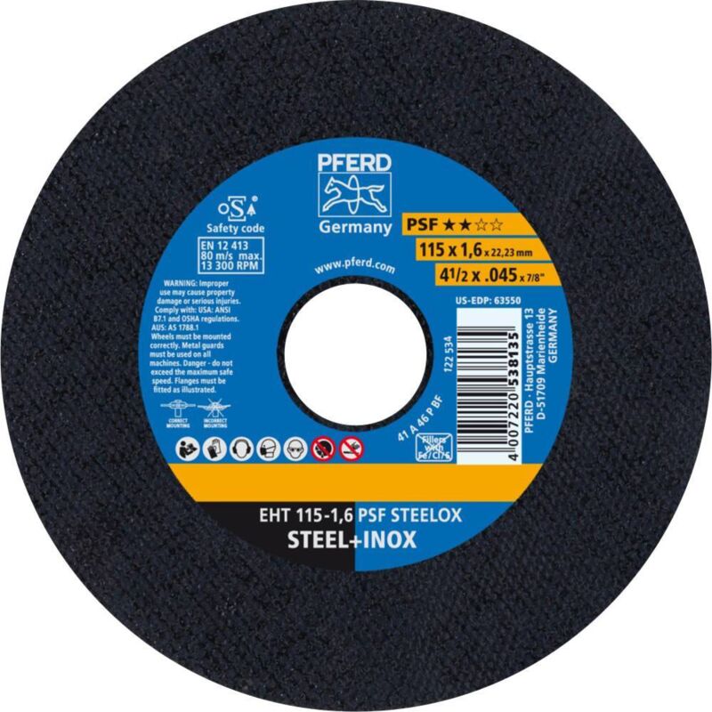 Dettagli tecnici Contenuto 25 pz. Dimensione del prodotto, larghezza 1.6 mm Dimensione, Ø 115 mm Dimensioni (Ø) 115 mm Idoneità del materiale Acciaio inox, Acciaio Tipo prodotto Disco di taglio dritto Ø foro 22.23 mm Tipi di azionamento: Smerigliatrice angolare a batteria, smerigliatrice angolare Attività di lavorazione: Creazione di interruzioni, separazione di lamiere, separazione di profili, separazione di materiale pieno DISCO DA TAGLIO EHT 115-1,6 PSF STEELOX Disco da taglio per acciaio e acciaio inox (INOX) con elevata potenza di separazione e buona durata. Testo tradotto automaticamente Punti di forza e dettagli Utilizzabile universalmente su acciaio e acciaio inox (INOX)Rapido avanzamento del lavoro grazie all'elevata potenza di separazioneElevata convenienza grazie alla buona durata Incluso nella consegna null Requisiti di sistema null