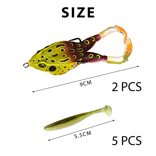 PFLYPF 2 esche per rana, esche da pesca, esche artificiali, 9 cm, in silicone morbido, con gancio, doppia elica, rane miste, in morbido silicone, con 5 esche artificiali