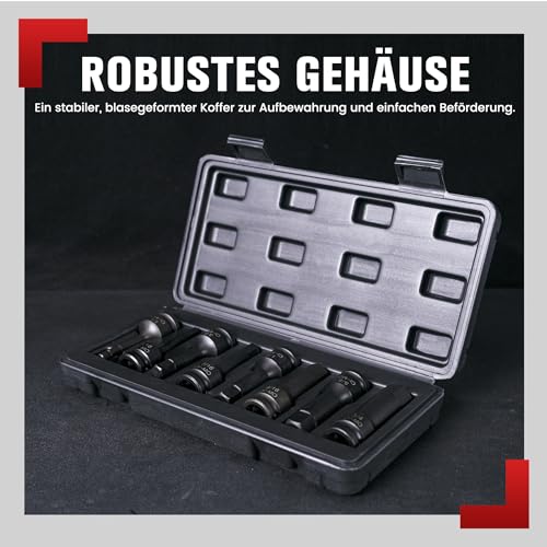 【SET DI BUSOLE AD IMPATTO】Ogni pezzo in questo set di bussole è lungo 3 pollici e viene fornito con un albero a bussola esagonale da 1/2 pollice per una presa solida e sicura. Funzionerà con avvitatori ad impatto o attrezzi a cricchetto. Foro per perno alla base di ciascuna bussola per l'uso con un perno di bloccaggio per un fissaggio sicuro agli attrezzi di guida.