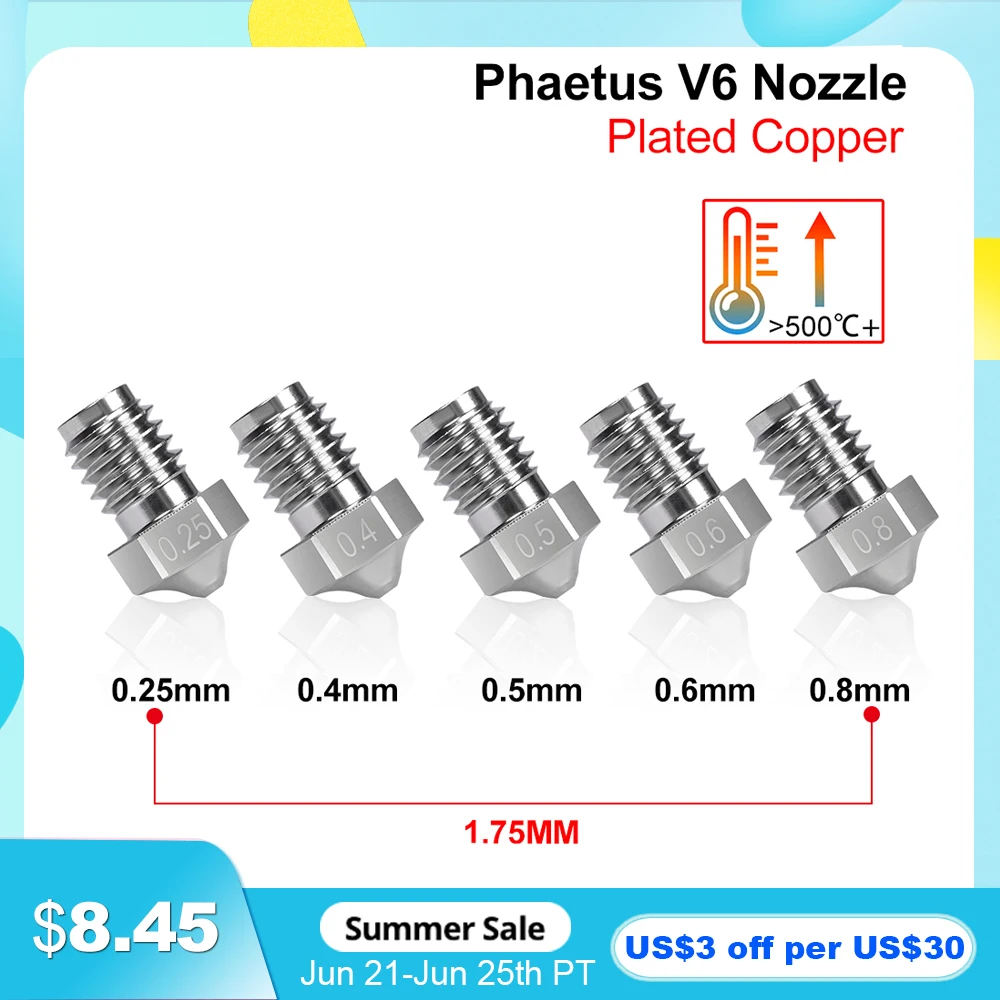 Phaetus V6 Nozzle Plated Copper 1.75MM Filament 0.25/0.4/0.5/0.6/0.8mm 3D Printer Parts For E3D V6 Hotend Prusa i3 MK3 Printer