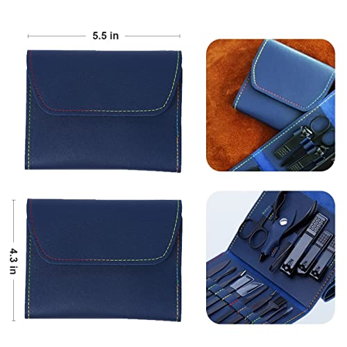 PHCOMRICH Set manicure in acciaio inox con custodia in pelle PU, per la cura delle unghie (blu)