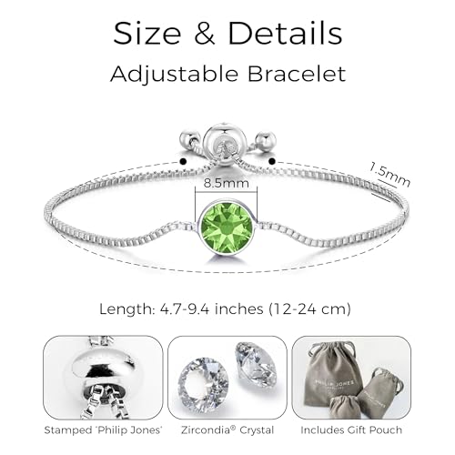 Realizzato con fiducia. Agosto (Peridot) Bracciale Pietra portafortuna creato con cristalli Zircondia da Philip Jones. Acquista con fiducia con la nostra garanzia del produttore di 12 mesi e garanzia di rimborso di 30 giorni se non sei soddisfatto al 100% del tuo braccialetto.
