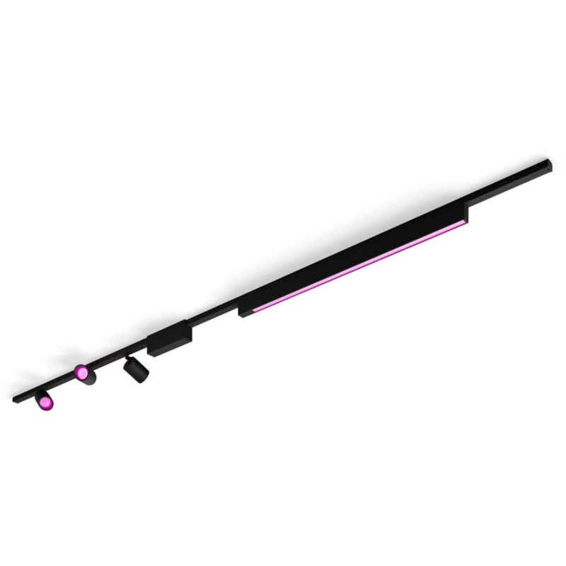Set con 3 faretti led e barra luminosa Philips Hue Perifo nero -40780000 Codice gpc 929003117501 Sistema da binari.Da soffitto set con 3 cilindri faretto e barra luminosa lineare Nero.Led integrato connesso SiTecnologia Zigbee+BTPotenza effettiva 43,80WTemperatura 2000+6500K + colorLumen 3580Tensione 24VDurata h 25000Grado di protezione IP20 Tipo: Lampada Tecnologia di illuminazione: LED