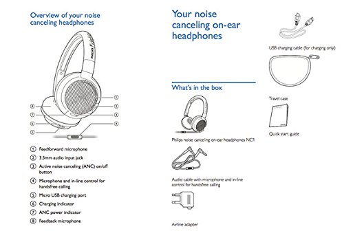 Contenuto confezione: cuffie Philips Fidelio NC1, spinotto per uso su aerei, cavo di ricarica USB, cavo audio, custodia da viaggio