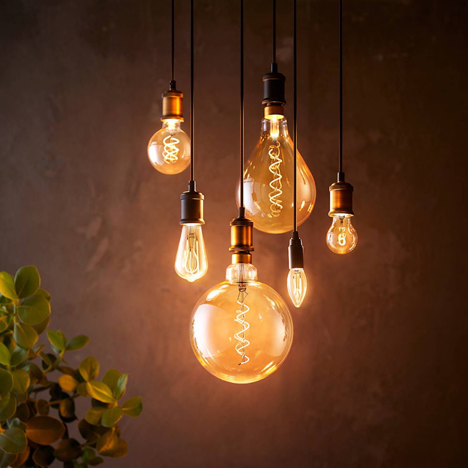 Lampada LED E27 7 W di forma grande con vetro dorato, dimmerabile Grazie alle sue dimensioni imponenti, con una lunghezza di oltre 29 cm, questa lampada LED è particolarmente adatta a tutti i tipi di apparecchi in cui il paralume è stato completamente omesso. I LED disposti in modo decorativo nel vetro dorato emettono una luce molto calda di 1.800 K, che viene emessa in modo uniforme e crea una bella atmosfera nel soggiorno. Questa sorgente luminosa soddisfa i criteri EyeComfort sviluppati da Philips. Produce una luce che non disturba gli occhi