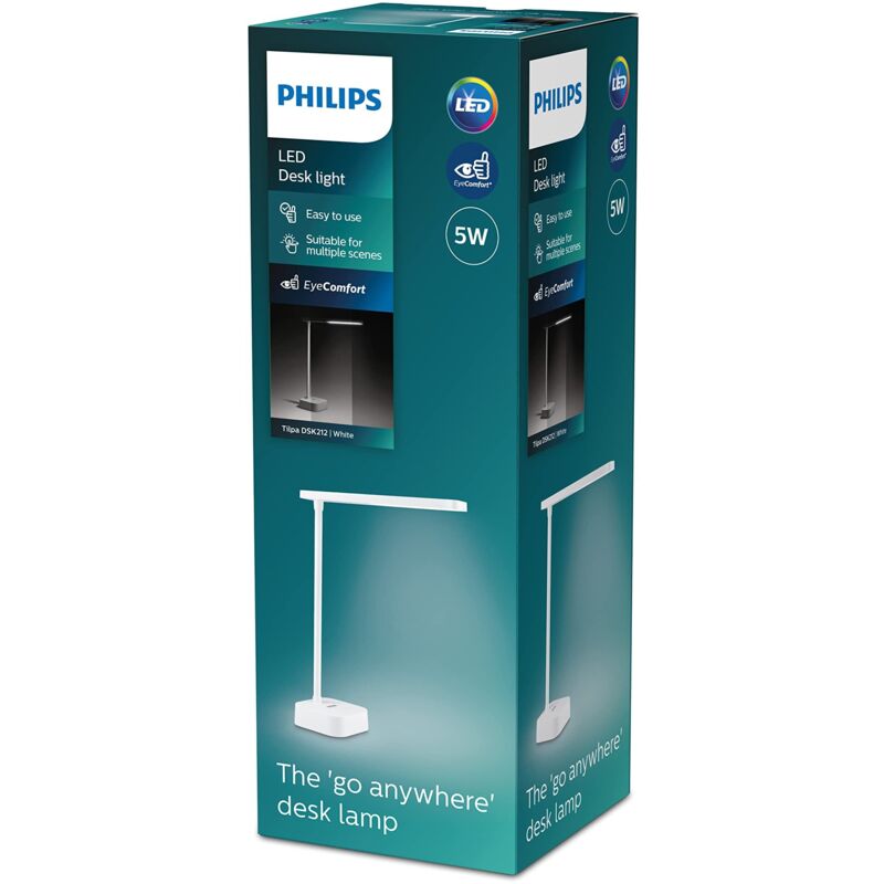 LAMPADA DA TAVOLO RICARICABILE TILPA 5W 50K BIANCA Con il suo design robusto e le prestazioni ottimali, la lampada da scrivania LED Philips Performance è l'apparecchio d'illuminazione ideale che fornisce qualità e luminosità in qualunque punto della casa. La luce è confortevole e non arreca fastidio agli occhi. Caratteristiche della lampadina • Uso previsto: Interno• Forma della lampada: RettangolareAspetto e Finitura• Colore: Bianco• Materiale: Plastica Durata • Vita media (con 2,7 ore di accensioneal giorno): 15 anno• Fattore di mantenimento del flussoluminoso: 70%• Numero di cicli di accensione espegnimento: 50.000Funzionalità aggiuntiva/accessorioincluso• Luce spot regolabile: No• Funzione di riduzione luminosità contelecomando: No• LED integrato: Sì• Telecomando incluso: No Caratteristiche luce • Uniformità colore: 6 SDCM• Indice di resa cromatica (CRI): 80• Tempo di riscaldamento perraggiungere il 60% del ussoluminoso