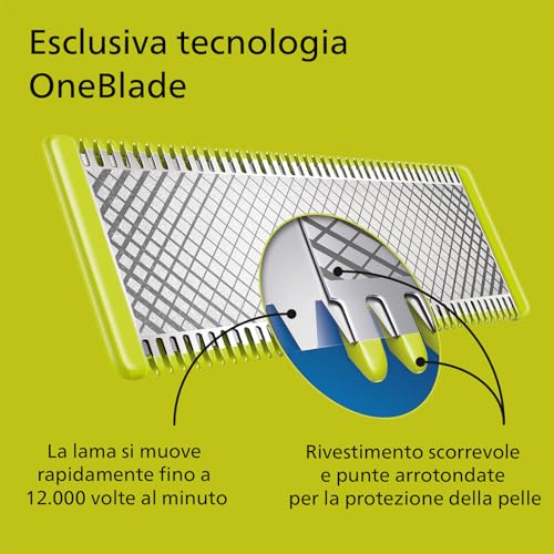 Esclusiva tecnologia OneBlade: progettato per lo styling del viso e la cura del corpo, per rifinire, regolare e rifinire i peli di qualsiasi lunghezza, è dotato di una fresa a movimento rapido (12000 movimenti al minuto)