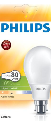 Philips, Softone - Lampadina fluorescente compatta standard, attacco a baionetta B22, 18 W, equivalente a 80 W, 10000 ore