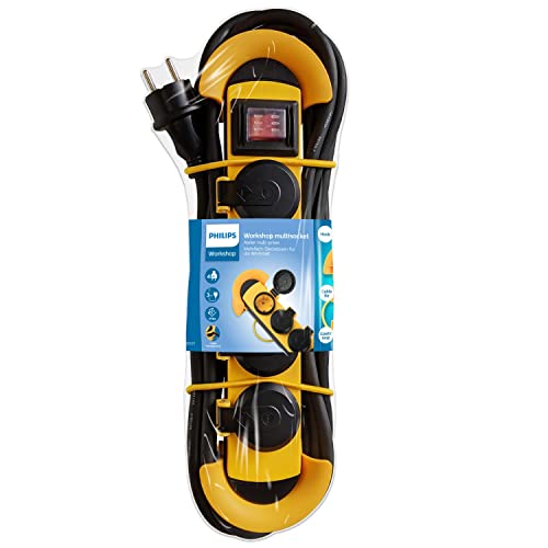 PHILIPS SPN5140YB/39 - Presa multipla per esterni, 4 prese, resistente agli spruzzi d'acqua secondo IP44, cavo da 3 m, interruttore e colore: nero/giallo