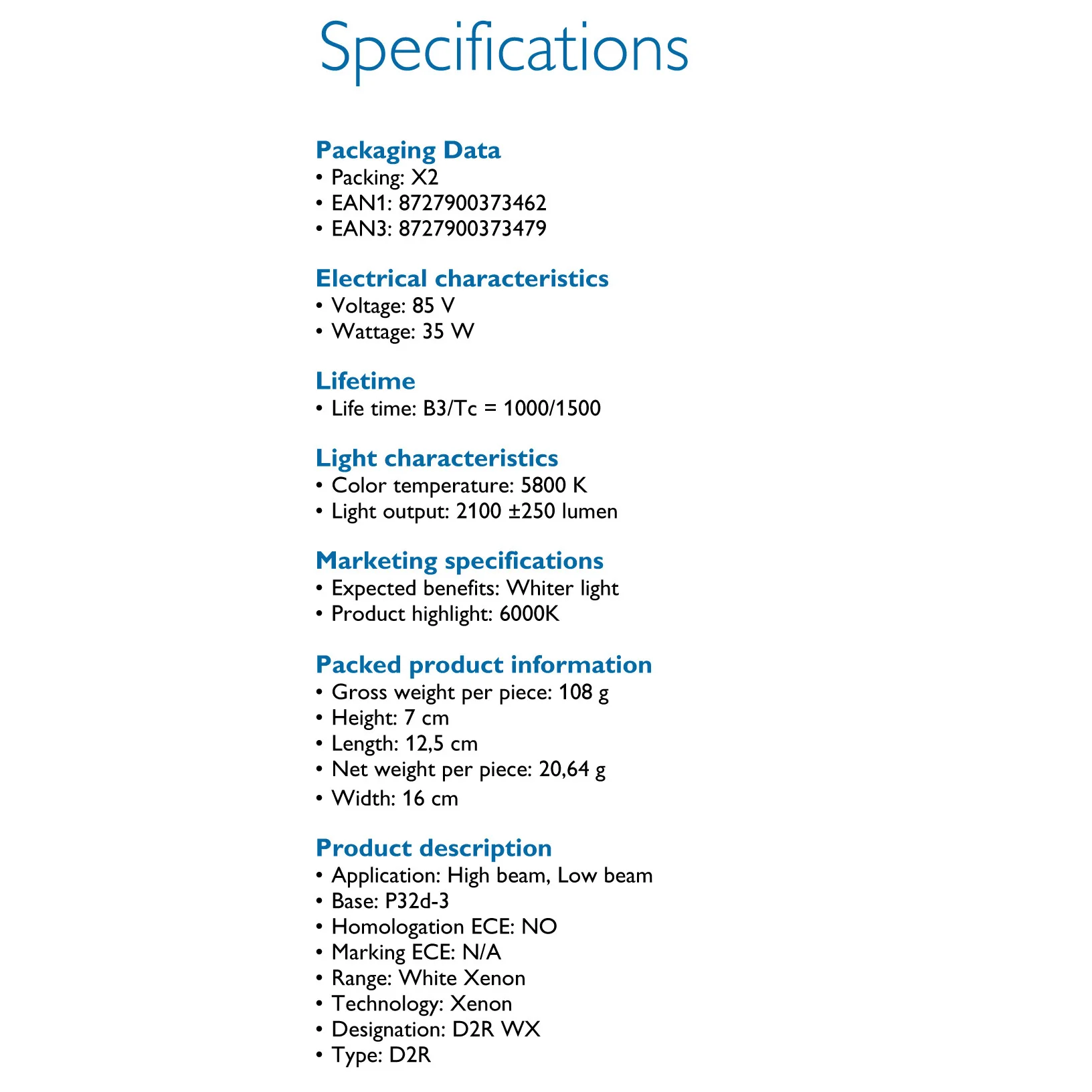 Philips Ultinon HID D2R 85126WXX2 35W 6000K Cool White Light Xenon HID Headlight Car Bulb Auto Lamp (Twin Pack)